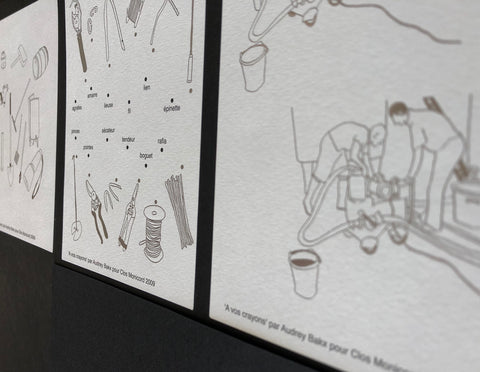 draw'. Each label shows a playful and educational puzzle inspired by different objects and tools used in the wine cellar at Clos Monicord. Each game is highlighted with fine hand drawings. These are printed using a hot stamped silver technique to remind on the one hand the grey pencil lead used for freehand drawing and on the other hand, the shiny aspect of tools and their