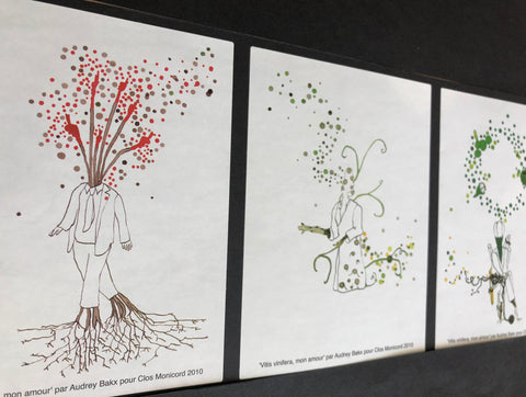 Ever since we produce wine Audrey, cellar wine mistress 😊 and creative brain, designs for each vintage story telling labels. Influenced by what she observes, experiences she illustrates each vintage with 6 different labels. Most vintages are out of stock, but luckily recent vintages are available, and we can still remember and look back at the labels.